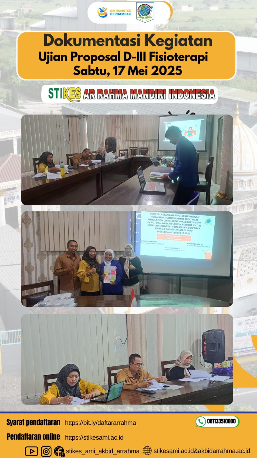 Pasuruan, 17 Mei 2025 — Program Studi D-III Fisioterapi STIKes Arrahma Mandiri Indonesia melaksanakan kegiatan Seminar Proposal yang diikuti oleh mahasiswa tingkat akhir. Kegiatan ini merupakan tahapan penting dalam proses penyusunan tugas akhir, yang bertujuan untuk menilai kelayakan dan kesiapan rencana penelitian mahasiswa. Seminar ini menghadirkan Ketua Penguji, Penguji 1, dan Penguji 2 yang secara aktif memberikan penilaian serta masukan akademik terhadap proposal yang dipresentasikan.