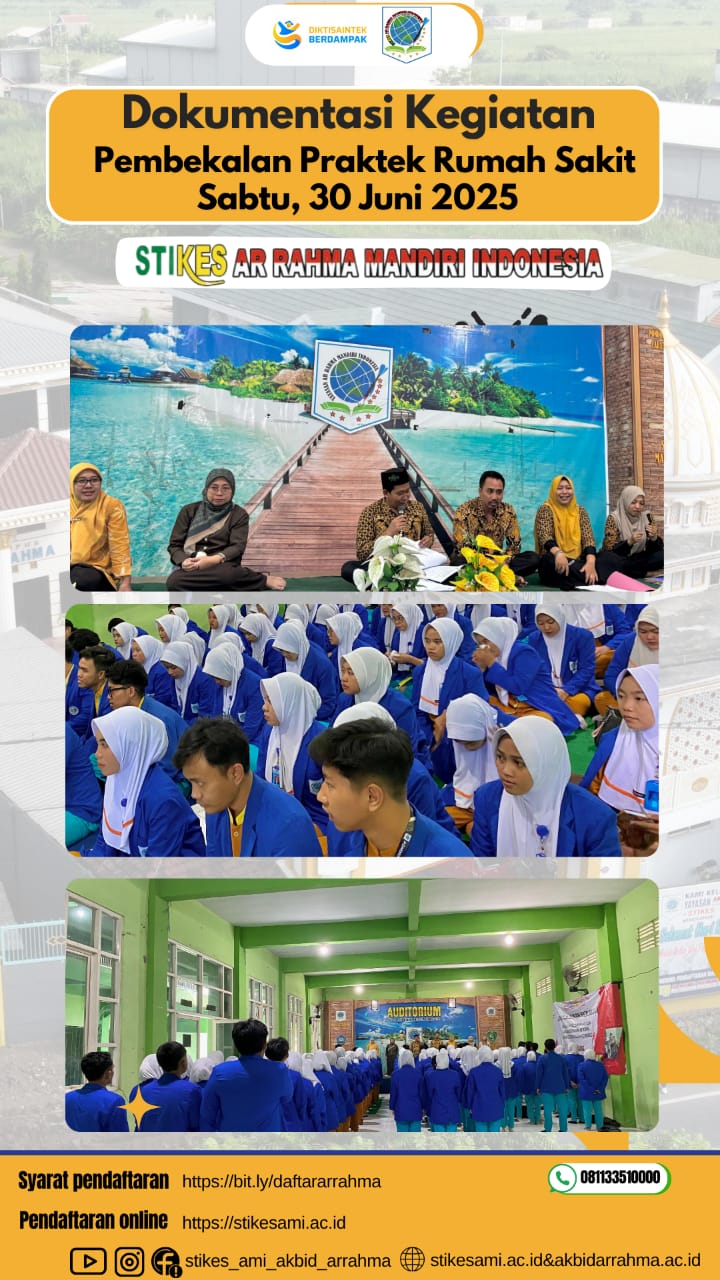 Pada hari ini Senin 30 Juni 2025, STIKES Arrahma Mandiri Indonesia menggelar acara pembekalan praktek rumah sakit bagi mahasiswa Program Studi S1 Administrasi Rumah Sakit, D-IV Perekam dan Informasi Kesehatan, dan D-III Fisioterapi. Acara ini dihadiri oleh Ketua STIKES Arrahma Mandiri Indonesia, Wakil Ketua I bidang Akademik, Wakil Ketua III bidang Kemahasiswaan Praktik, dan Kaprodi masing-masing program studi.