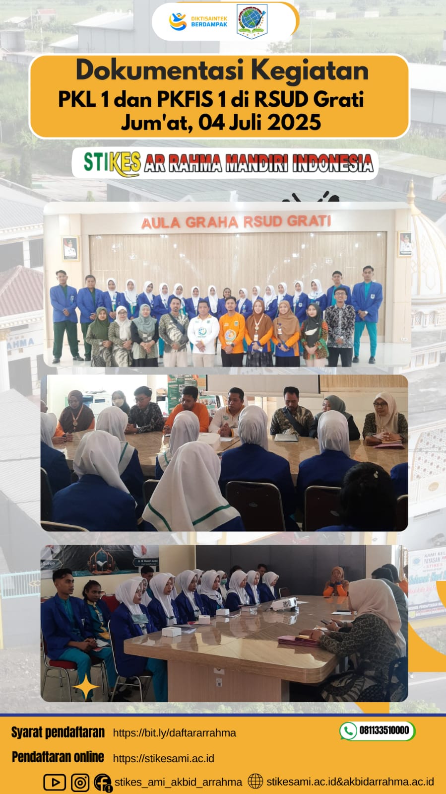 Jum’at 04 Juli 2025 dilaksanakan pembukaan Praktik Kerja Lapangan (PKL) 1 dan Praktik Klinik Fisioterapi (PK-Fis) 1 Mahasiswa STIKES Arrahma Mandiri Indonesia di RSUD Grati. Acara pembukaan ini dihadiri oleh PLT. Direktur RSUD Grati, Kepala bidang Rawat Inap, Kepala bidang Rawat Jalan, Kepala unit RM, CI Rekam Medis, Kepala Diklat, dan Penjaminan mutu dari pihak rumah sakit. Sementara itu, dari STIKES Arrahma Mandiri Indonesia hadir Waket III Bidang Kemahasiswaan dan Praktik, Kaprodi D-IV Perekam dan Informasi Kesehatan, Kaprodi D-III Fisioterapi, dan staf STIKES Arrahma Mandiri Indonesia.