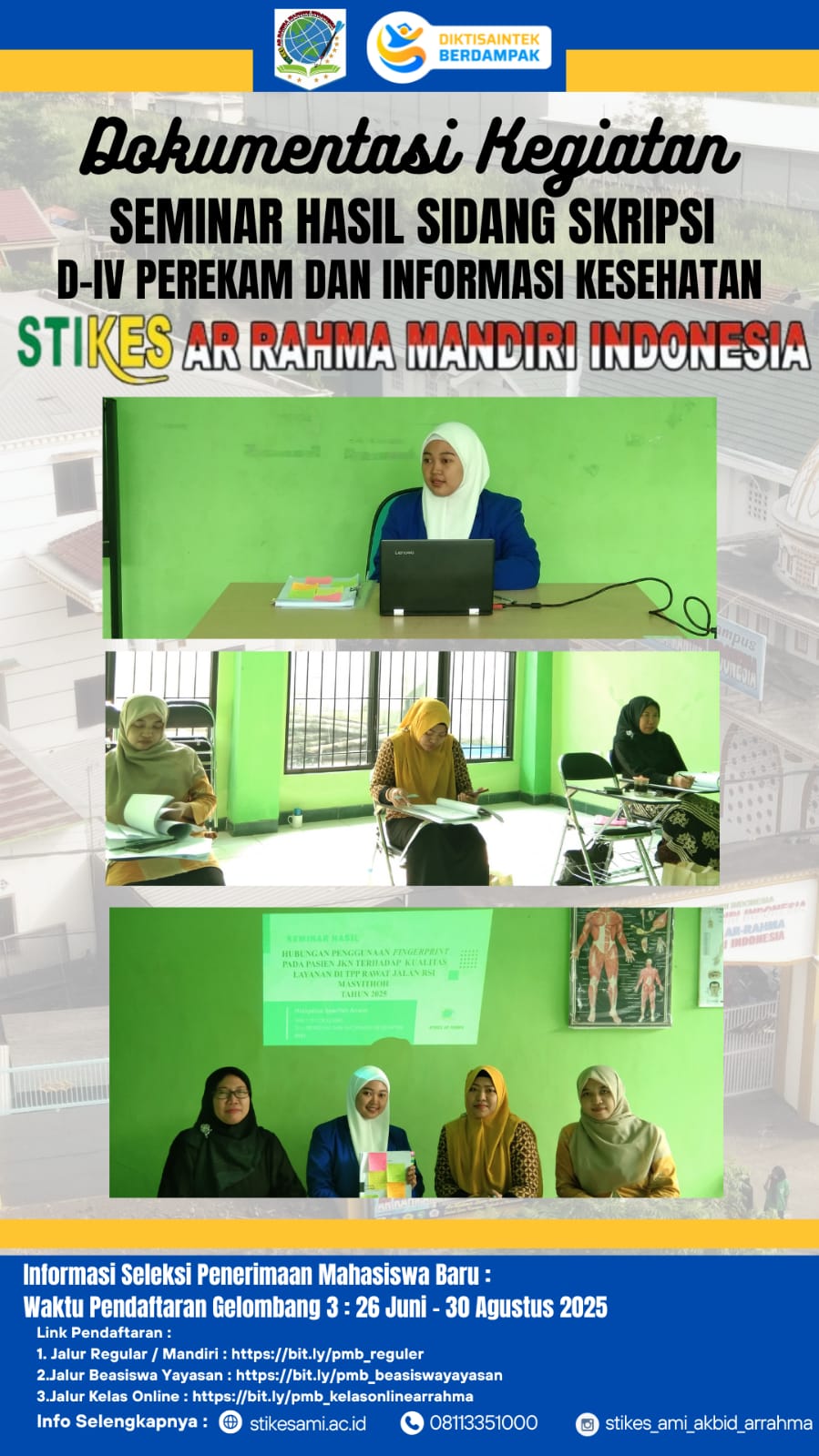 Mahasiswa Program Studi D-IV Perekam dan Informasi Kesehatan STIKES Arrahma Mandiri Indonesia melaksanakan sidang skripsi pada Senin, 28 Juli 2025. Kegiatan ini merupakan salah satu tahapan akhir yang krusial dalam proses penyelesaian studi, di mana mahasiswa harus mempertanggungjawabkan hasil penelitiannya di hadapan dewan penguji.