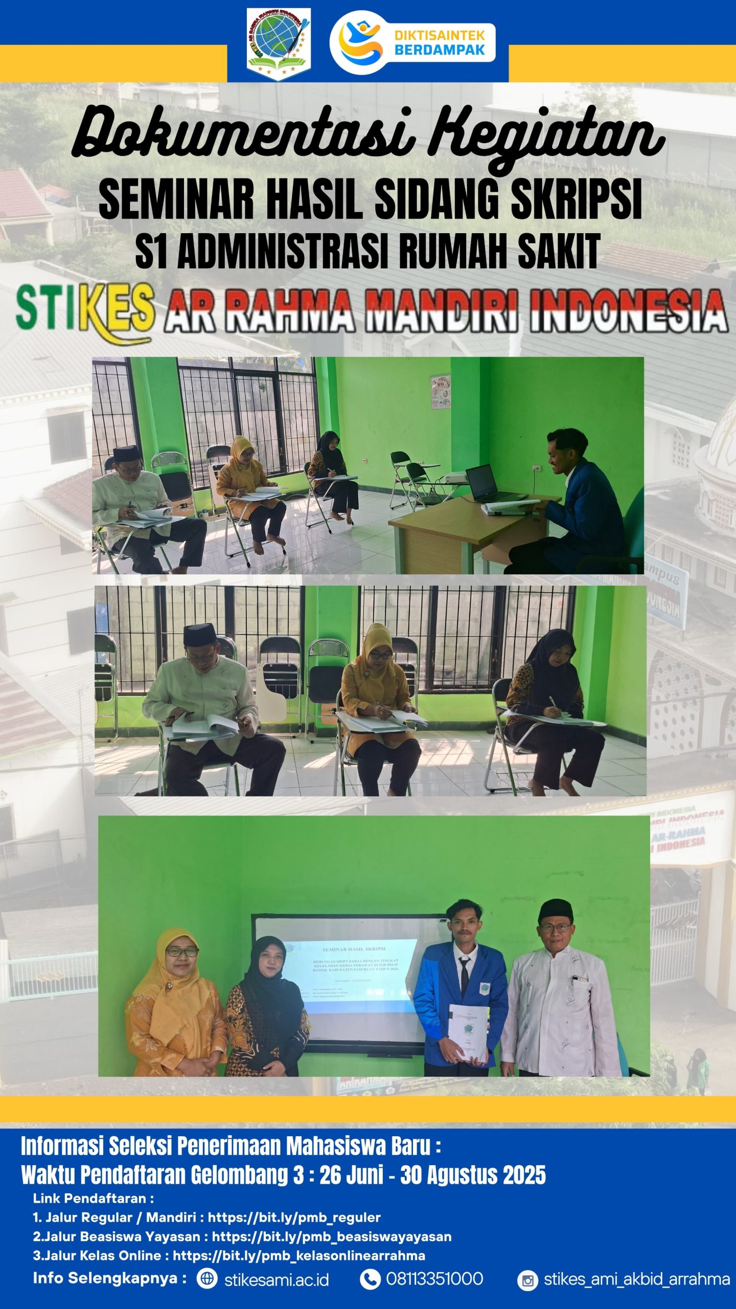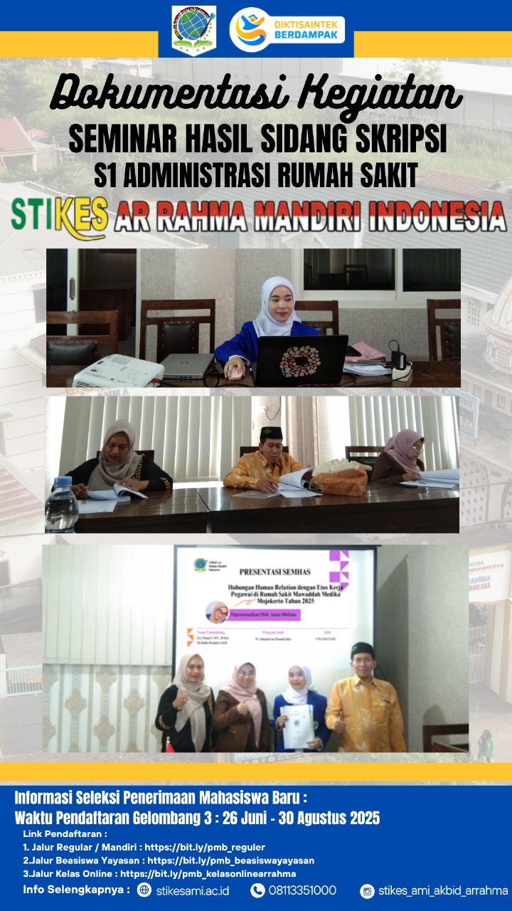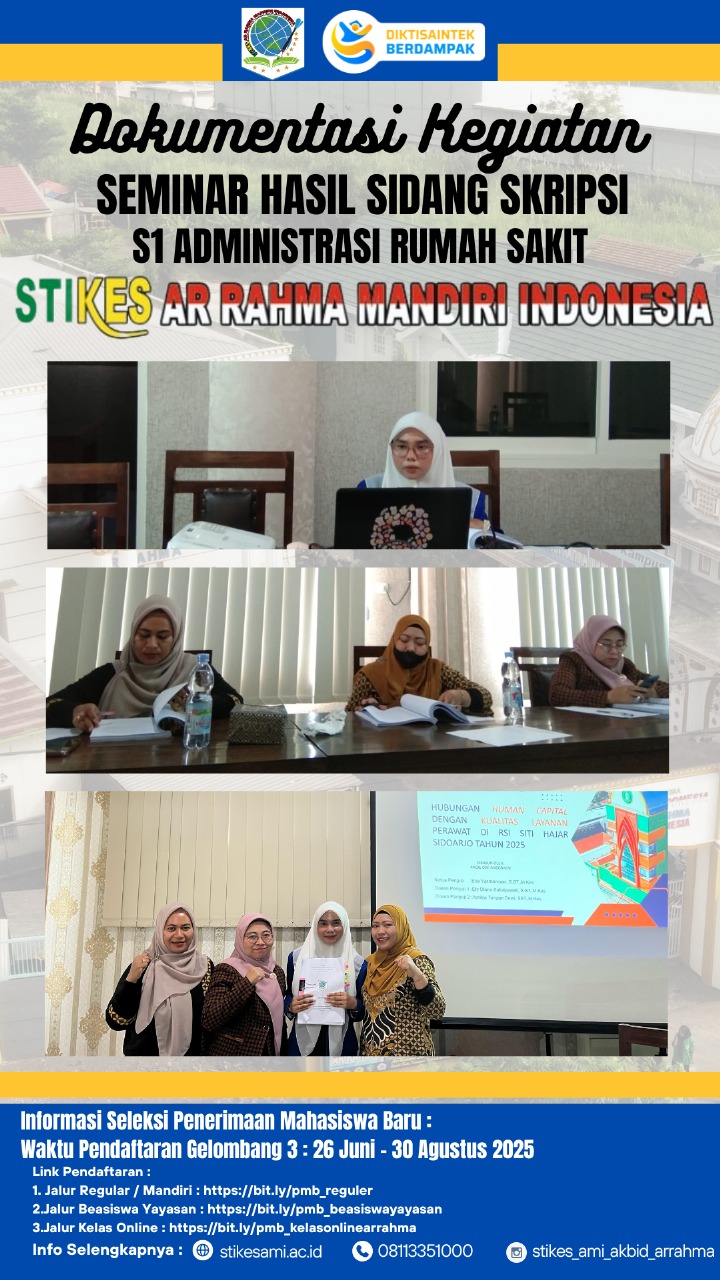 Pada Senin, 4 Agustus 2025, STIKES Arrahma Mandiri Indonesia menyelenggarakan Seminar Hasil Sidang Skripsi bagi mahasiswa S1 Administrasi Rumah Sakit. Acara ini menjadi momen penting dalam proses akademik mahasiswa, di mana mereka mempresentasikan hasil penelitian skripsi di depan para penguji. Dalam seminar tersebut, mahasiswa mempresentasikan hasil penelitiannya dengan percaya diri, menjelaskan setiap aspek penelitian dengan jelas dan menjawab pertanyaan-pertanyaan yang diajukan oleh penguji.
