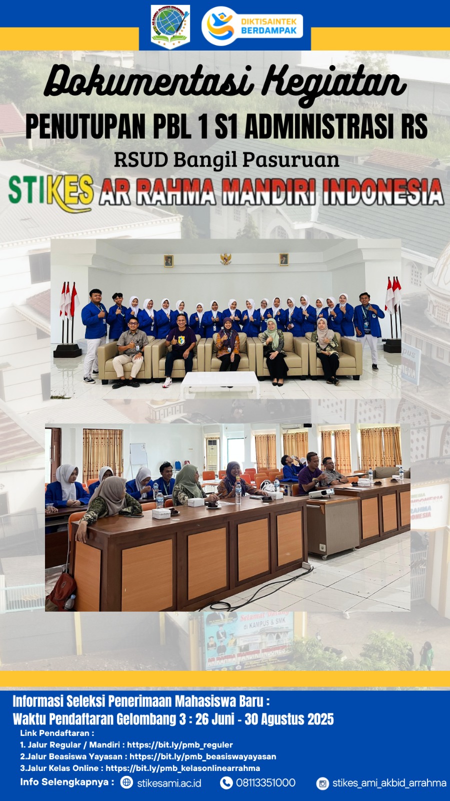 Pada Jumat, 1 Agustus 2025, STIKES Arrahma Mandiri Indonesia secara resmi menutup kegiatan Praktek Based Learning (PBL) 1 bagi mahasiswa S1 Administrasi Rumah Sakit di RSUD Bangil Pasuruan. Acara penutupan ini dihadiri oleh pihak rumah sakit, termasuk Manajemen Kepegawaian, Manajemen Pelayanan, dan Manajemen Keuangan. Dari STIKES Arrahma Mandiri Indonesia, Waket 1 bidang Akademik dan Kaprodi S1 Administrasi Rumah Sakit turut hadir dalam acara tersebut.